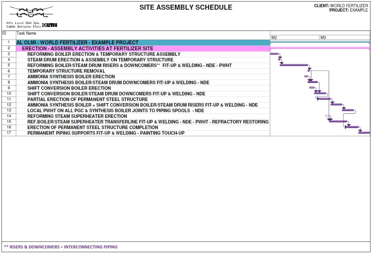 The site assembly of large ammonia PGB packages is a mix of supplier and contractor experience. Therefore, the schedule given in Figure 3 is for reference only as there may be large variations and changes depending on contractor requirements and plant erection schedules. Since the steam drum is frequently not provided with independent supports but it is supported by the interconnecting piping, the assembly is difficult and requires important resources. The most critical operations usually are: