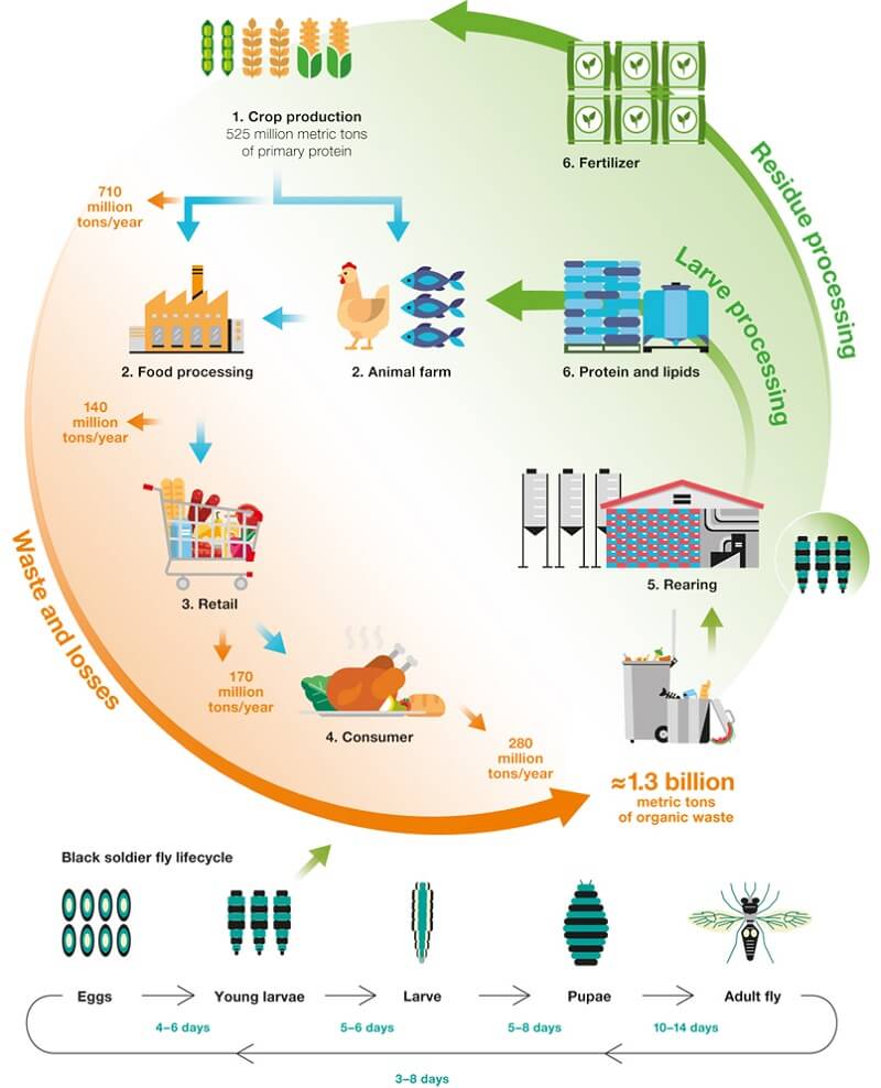 Rather, the primary focus is on producing animal feed derived from insect farming, which is much more sustainable and efficient. Generating one kilogramme of insect-based protein only requires two kilogrammes of feed, while proteins made from cattle require 20kg of feed for the same result.